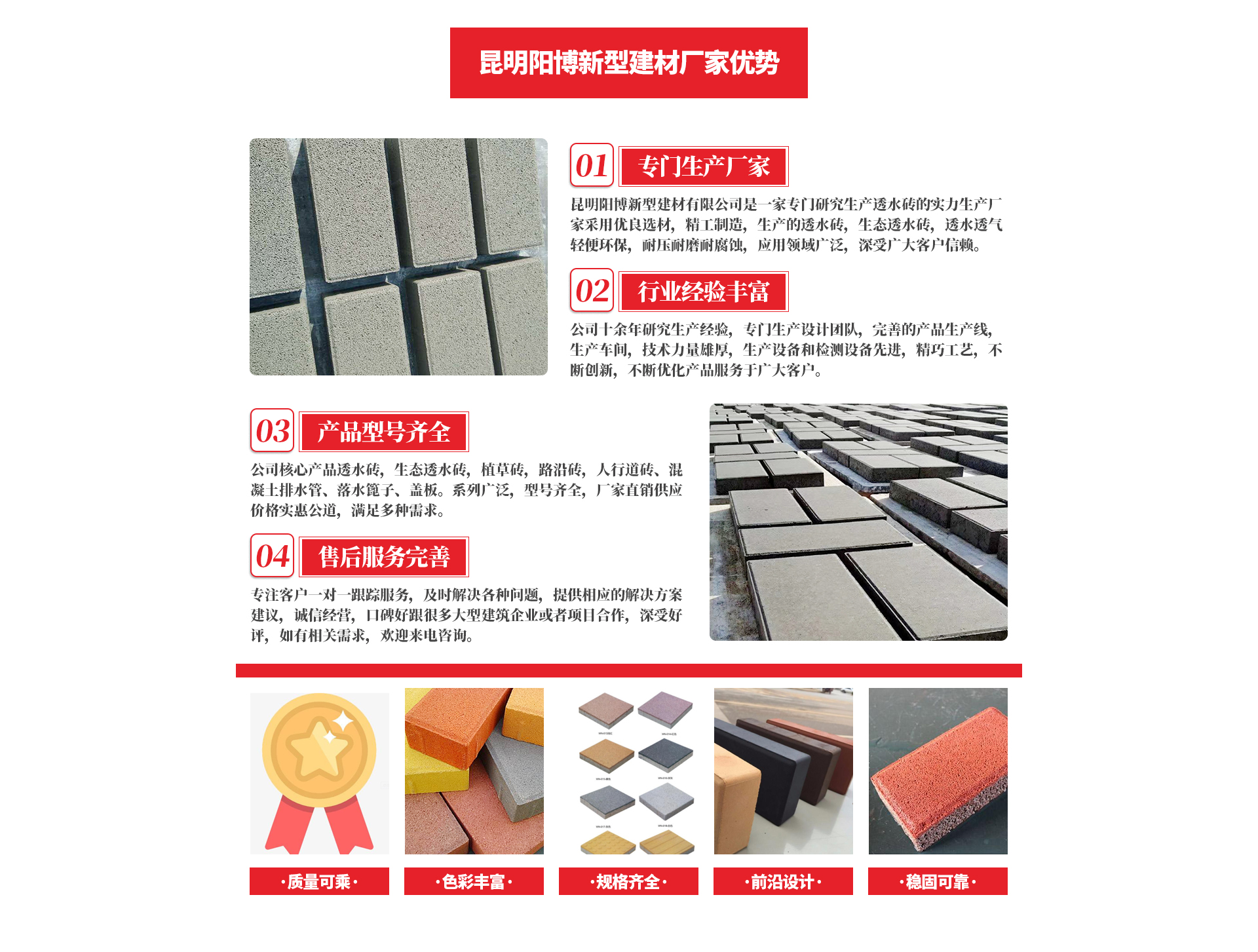昆明陽(yáng)博新型建材有限公司(原星貿(mào)水泥制品廠(chǎng))始建于2007年,現(xiàn)有西三環(huán)總廠(chǎng)、桃園制管分廠(chǎng)、沙靠構(gòu)件分廠(chǎng),生產(chǎn)和銷(xiāo)售鋼筋混凝土排水管、人行道磚、透水磚、落水篦子、蓋板、路沿石等各類(lèi)混凝土預(yù)制構(gòu)件。經(jīng)過(guò)十余年發(fā)展,公司取得了“國(guó)內(nèi)工業(yè)產(chǎn)品生產(chǎn)許可證”、“混凝土預(yù)制構(gòu)件三級(jí)資質(zhì)”、“試驗(yàn)室證書(shū)”等資質(zhì),并先后獲得了云南省混凝土協(xié)會(huì)和云南省水泥制品協(xié)會(huì)授予的“企業(yè)發(fā)展獎(jiǎng)”、“突出貢獻(xiàn)獎(jiǎng)”、“副主任委人員單位”等榮譽(yù)。我公司從成立至今,產(chǎn)品和服務(wù)深受用戶(hù)信賴(lài),遠(yuǎn)銷(xiāo)省內(nèi)外。先后承接了中鐵十五局集團(tuán)第四工程有限公司昆明市官渡13號(hào)路排水工程項(xiàng)目、中鐵上海工程局市政工程有限公司昆明主城南片排水管網(wǎng)完善工程項(xiàng)目、中鐵建設(shè)集團(tuán)有限公司大漁路項(xiàng)目、中鐵八局集團(tuán)昆明鐵路建設(shè)有限公司昆明排水管網(wǎng)完善工程項(xiàng)目、山東黃河工程集團(tuán)有限公司昆明北沙地項(xiàng)目等的排水管道...